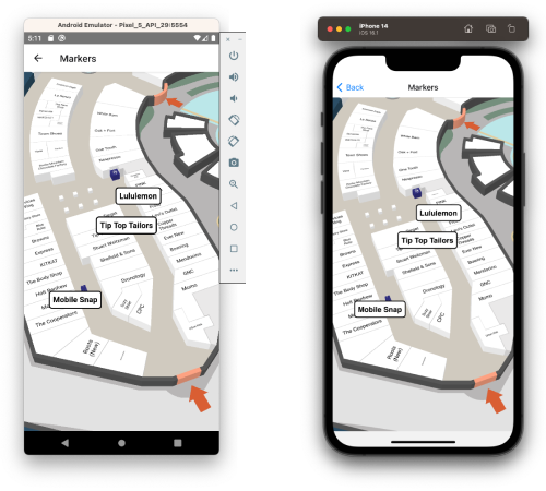The Mappedin SDK for React Native allows you to add markers to the map. These are elements containing arbitrary HTML that the SDK will anchor to a MappedinNode or a MappedinCoordinate on the map, and automatically handle rotation and repositioning to face the camera.